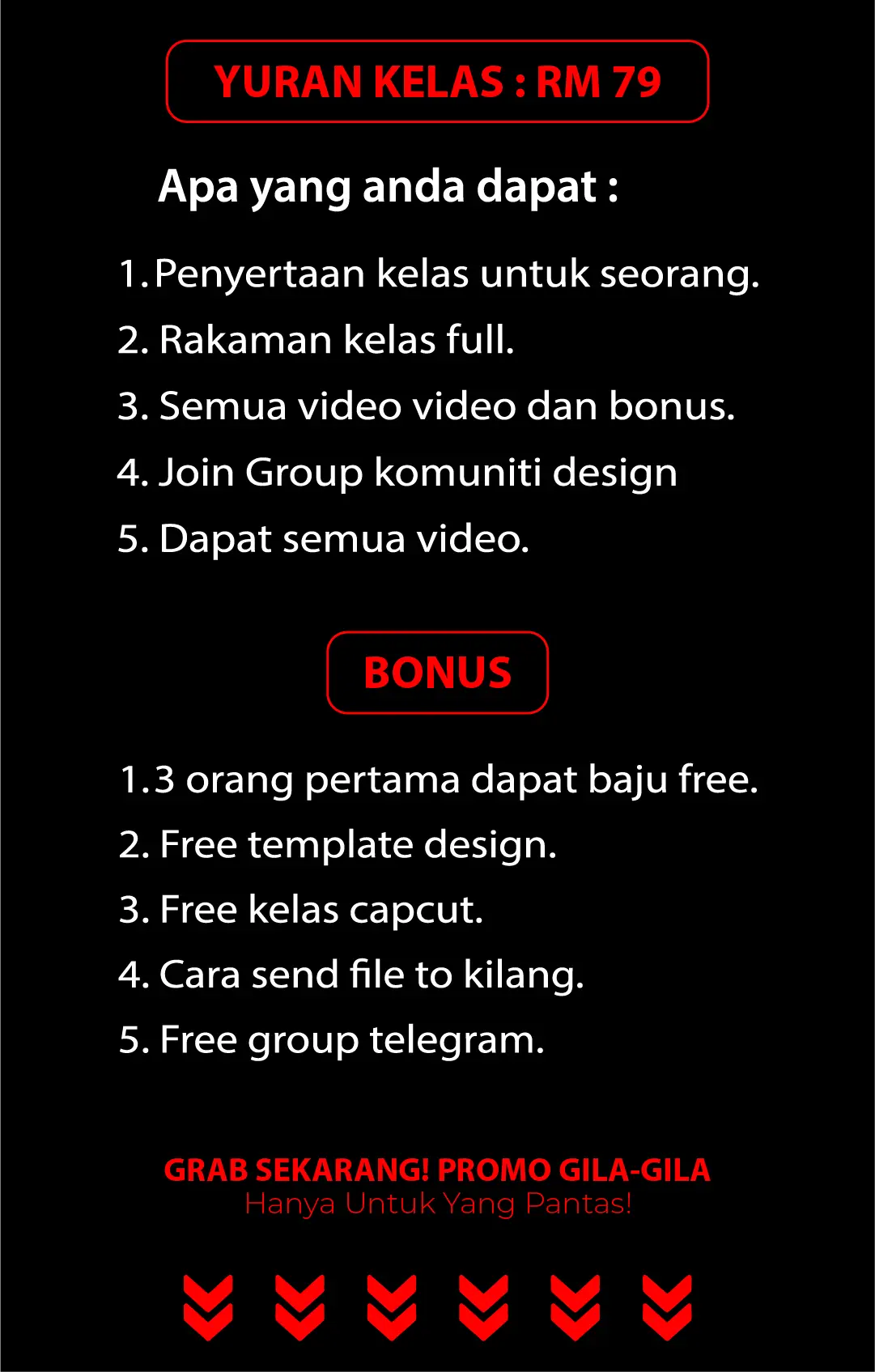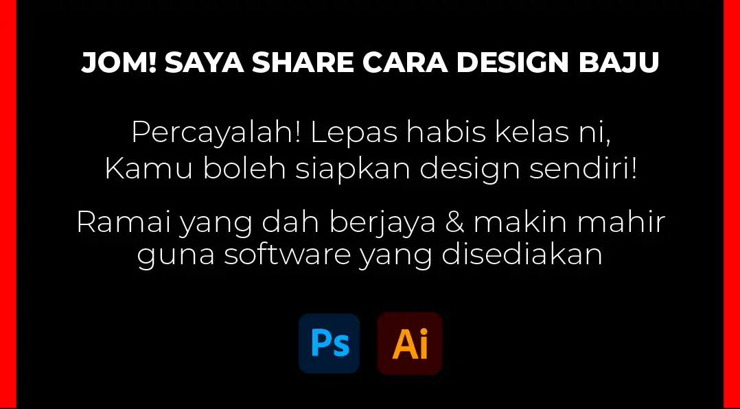 utama FREE GROUP TELEGRAM BELAJAR DARI BASIC KE ADVANCEDDENGAN TEMPLATE Nak belajar keluarkan brand baju sendiri tapi taktahu nak mula dari mana. Jangan risau!saya tunjuk step-by-step sampai boleh buat sendiri, Siap guna, terus hasilkan design padu 2 YEAR EXPERIENCE BEGINNER TO ADVANCE Tak pernah design baju, sesuai join kelas ini ? Ya, sesuai !sebab dalam kelas ini, saya ajar dari basic sampai advance - termasuk tips design baju & cara guna software. SOFTWARE APA YANG KITA GUNA ? Sebenarnya, ada banyak software untuk design baju tapi kali ini kita akan fokus kepada adobeterutamanya adobe illustrator DALAM KELAS Pengenalan sofware Rahsia sofware trick and tips adobe illustrator cara design baju cara guna photoshop cara buat mockup final Click here Click here